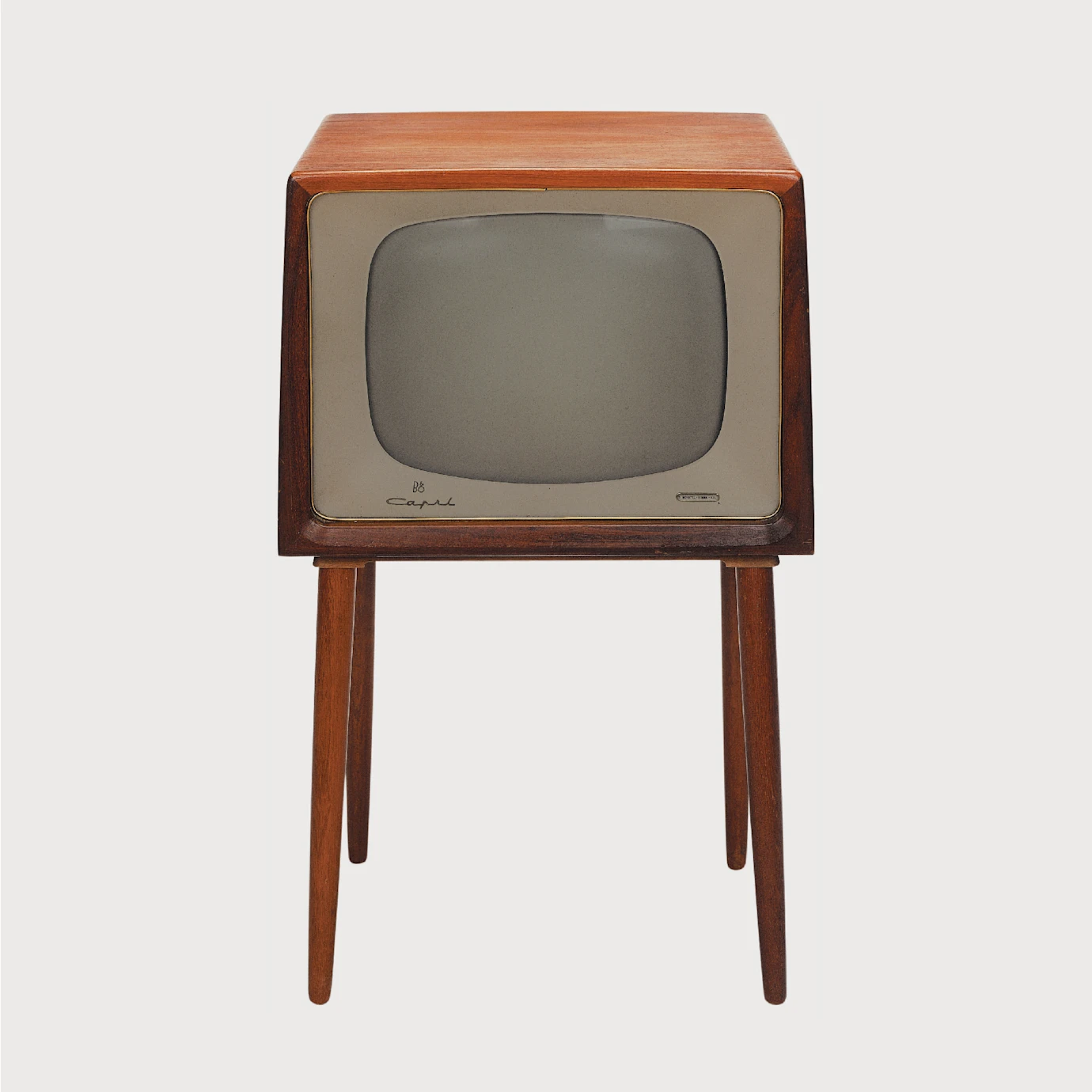Cet élégant téléviseur en teck de 17″ sur pieds fixes constitue le premier modèle d’une série d’appareils empruntant à l’ameublement moderne danois ses expressions, ses matières et ses formes. Les longs pieds, les coins arrondis et l’écran gris légèrement incliné devant le tube cathodique représentaient une étape importante dans le développement d’un aspect plus minimaliste.